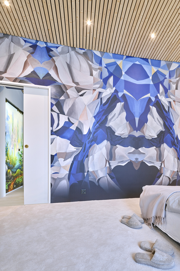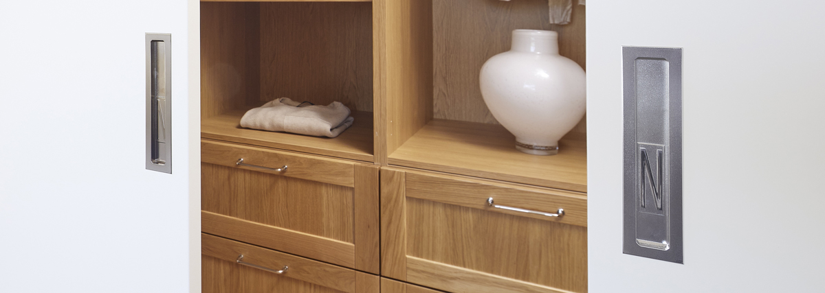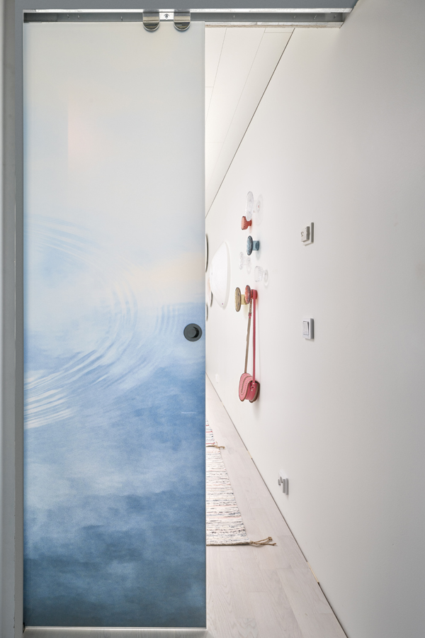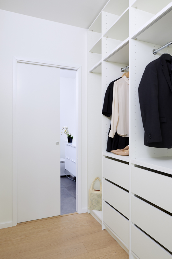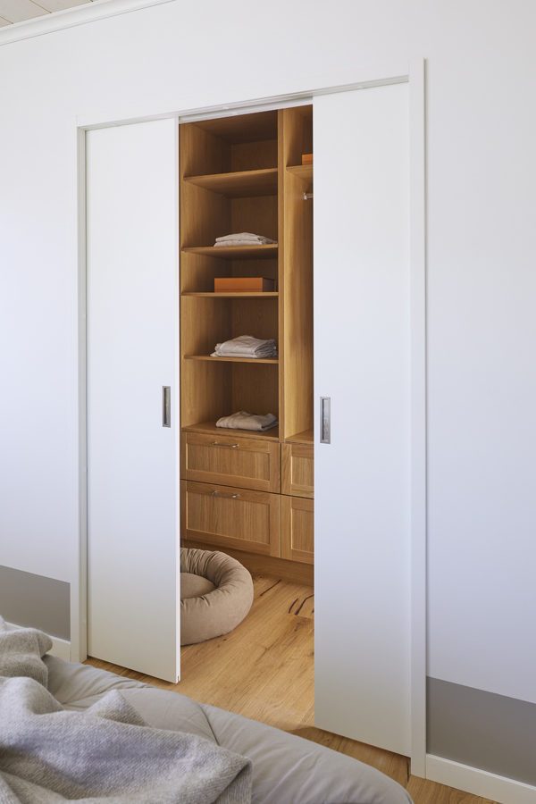 - Tilavan talon yläkerrassa sijaitsevan makuuhuoneen yhteyteen sijoitettu vaatehuone avautuu saumattomaksi kokonaisuudeksi Liunen pariovien avulla.
